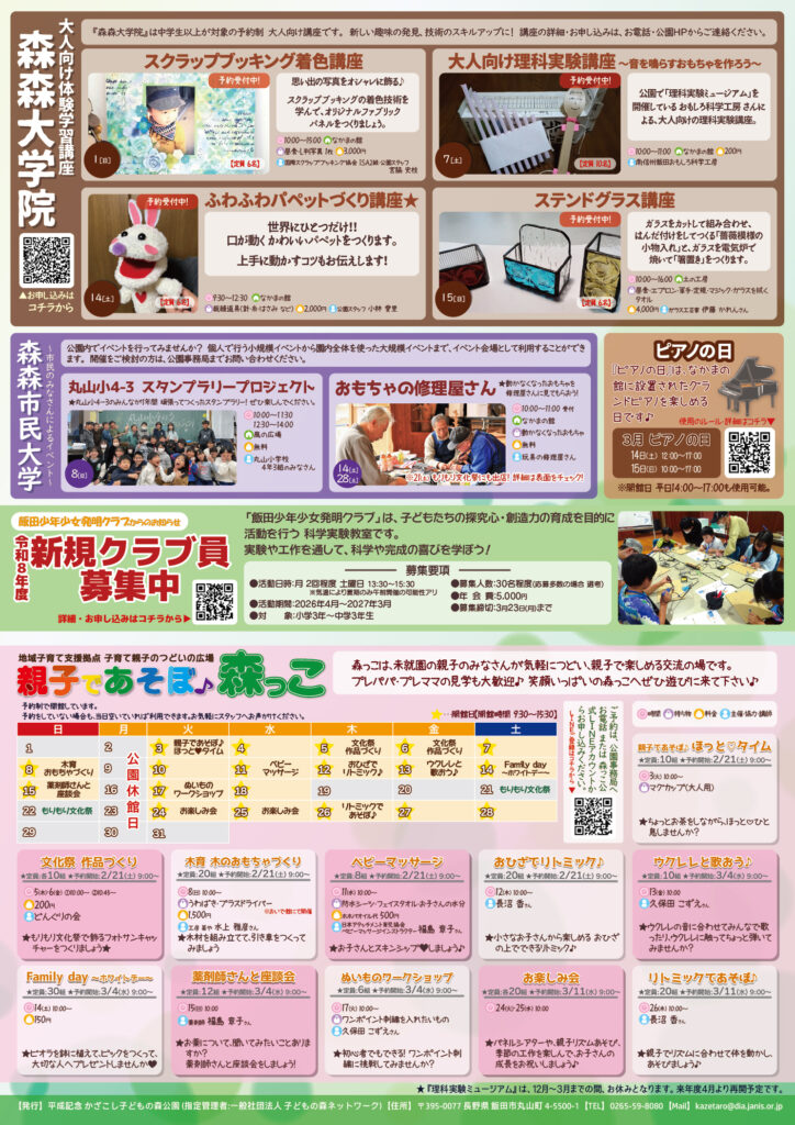 子どもの森だより 2026年3月号 発行のお知らせ 2026.02.05子どもの森だより Tweet Share RSS 子どもの森だより 3月号 子どもの森だよりが発行されました! 表記の内容は、主催者の都合により変更となる可能性があります。最新情報は、お知らせ・開催予定のイベントにてご確認ください。 子どもの森だよりは、公園事務局や、飯田市内 公共施設にて配布しています。 子どもの森だより バックナンバー Tweet Share RSS 子どもの森だより2026年, 3月, もりもり文化祭