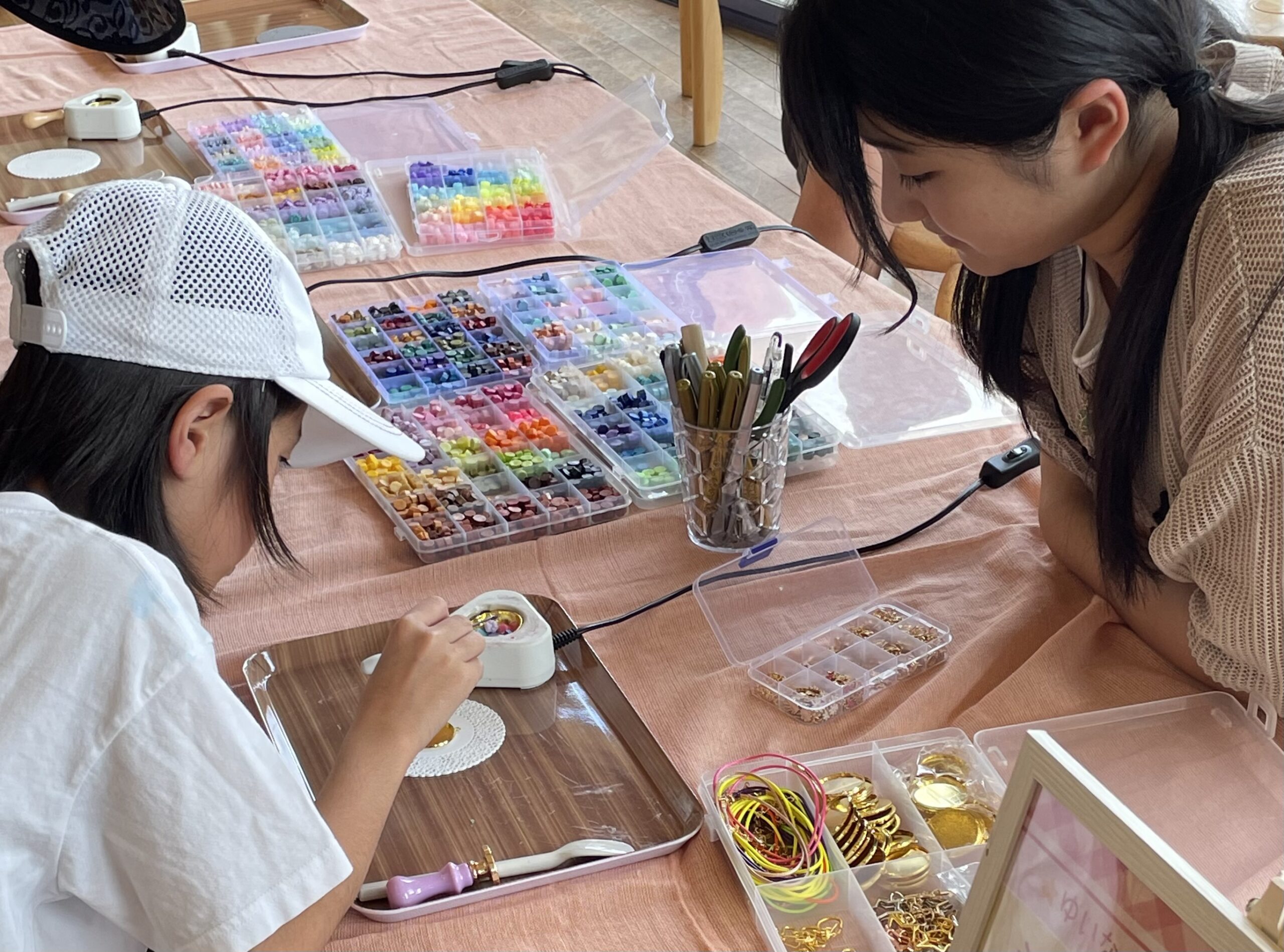 UVレジン、パラコードアクセサリー、せっけんづくり、シーリングスタンプアクセサリー、パステルアート、毛糸の一輪ざしアート、七宝焼など…さまざまな出店があります!